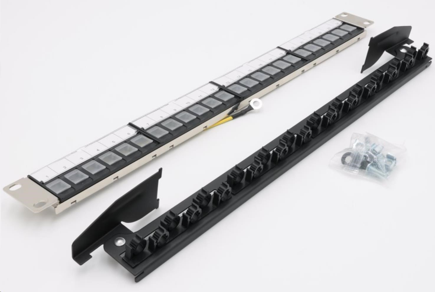 včetně montážní sada M6 do rozvaděčů (4x šroubek + 4x matka + 4x podložka) Kovový patch panel s unikátním způsobem instalace keystonů s vyvazovákem. Čelní panel překryt čtyřmi plasty po 4 otvorech, možno osadit 4 moduly po 6 pozicicíh pro keystony. Zemnící kabel a pozice pro umístění popisek