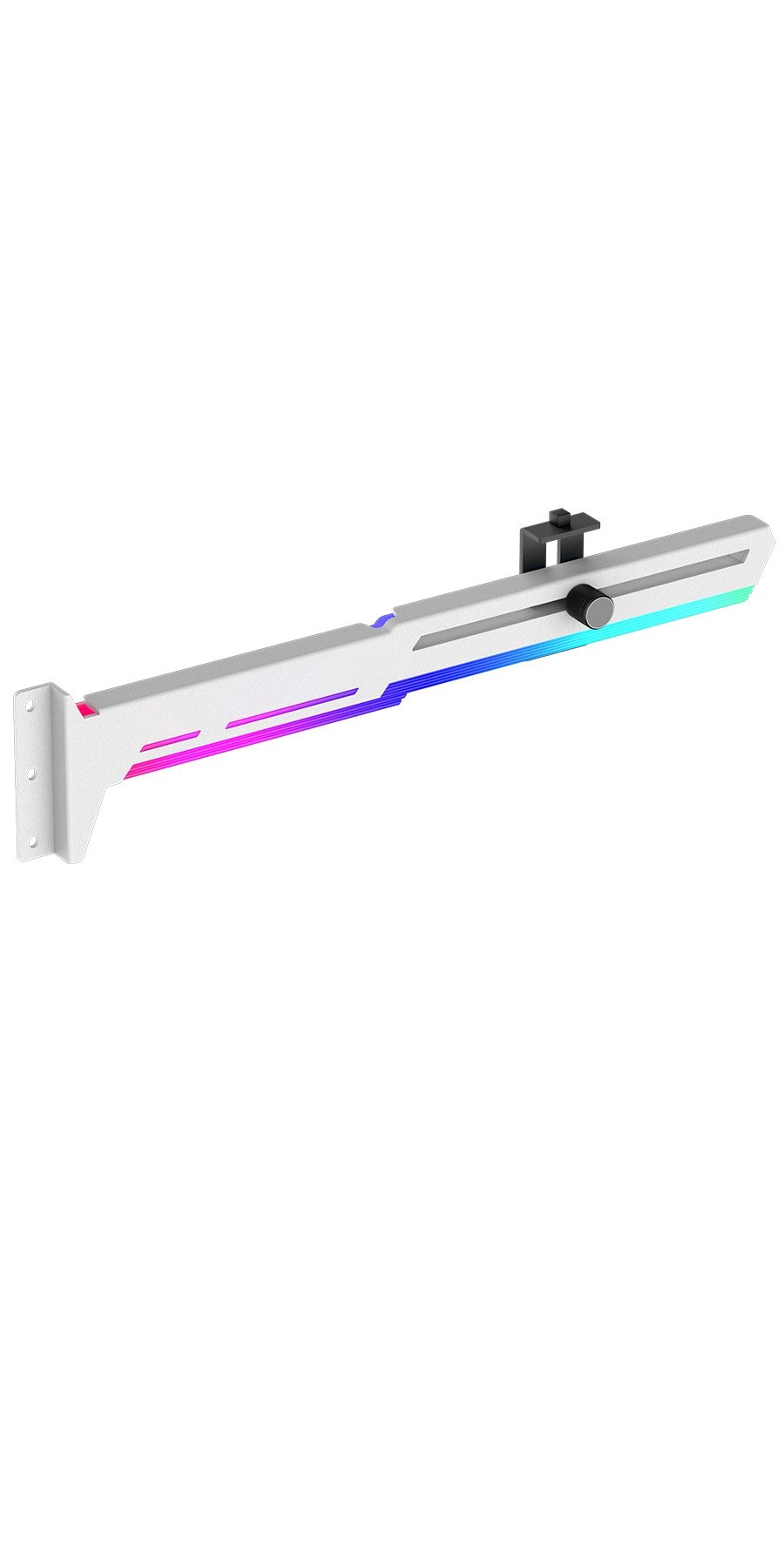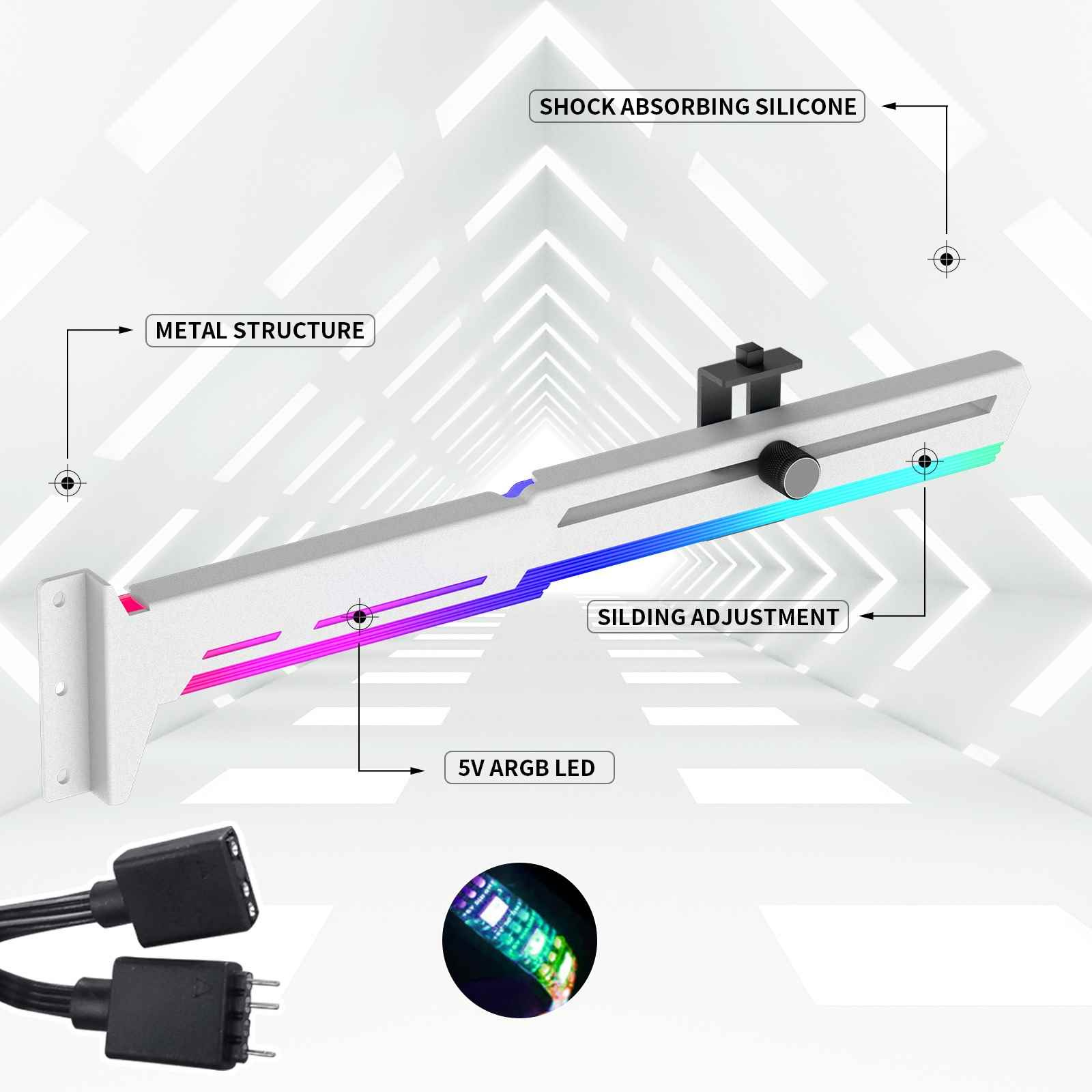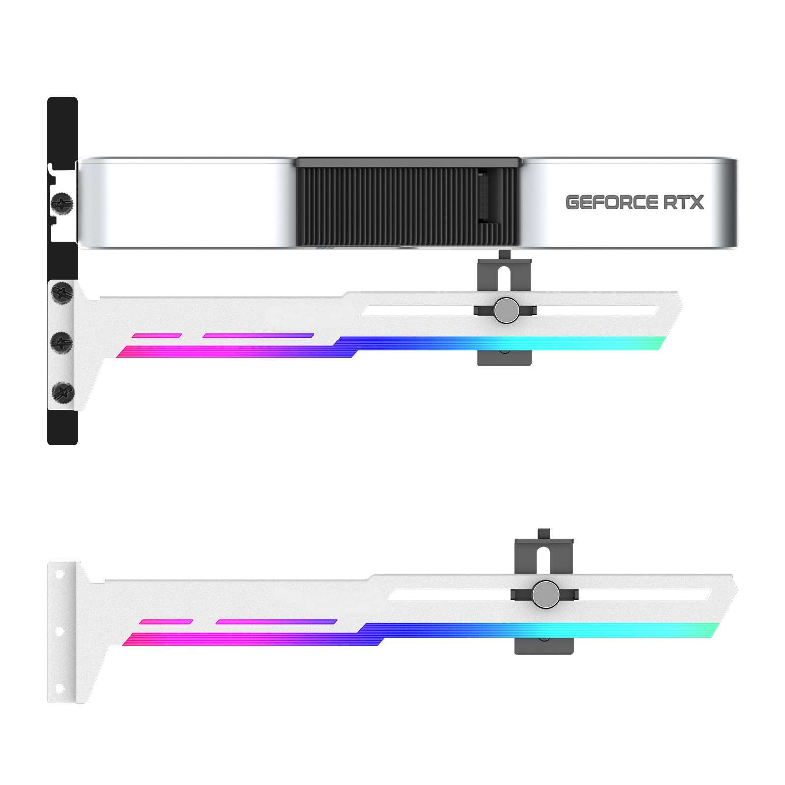 Stylová varianta této opory Vaší grafické karty je vyrobena z ocelového práškově lakovaného plechu a plastu, zabraňuje prohýbání větších karet ve slotu a dodává tak sestavě lepší celkovou stabilitu. Součástí je silikonová posuvná opora, kterou lze posunout jak horizontálně tak i vertikálně a umožňuje instalaci v různých místech karty, pro maximální kompatibilitu s většinou karet. Rozměry držáku jsou 280 x 52mm.