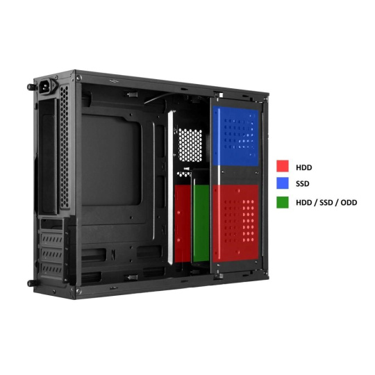 Provedení skříně:Mini Tower / micro ATX; Barva skříně:Černá; Počet pozic 5.25":1; Počet pozic 3.5" (HDD):1; Počet pozic 2.5" (SSD):1; Bočnice:Plná; Podsvícení:bez podsvícení; Vybavení PC skříně:Přední Audio panel, Přední USB panel.... více
