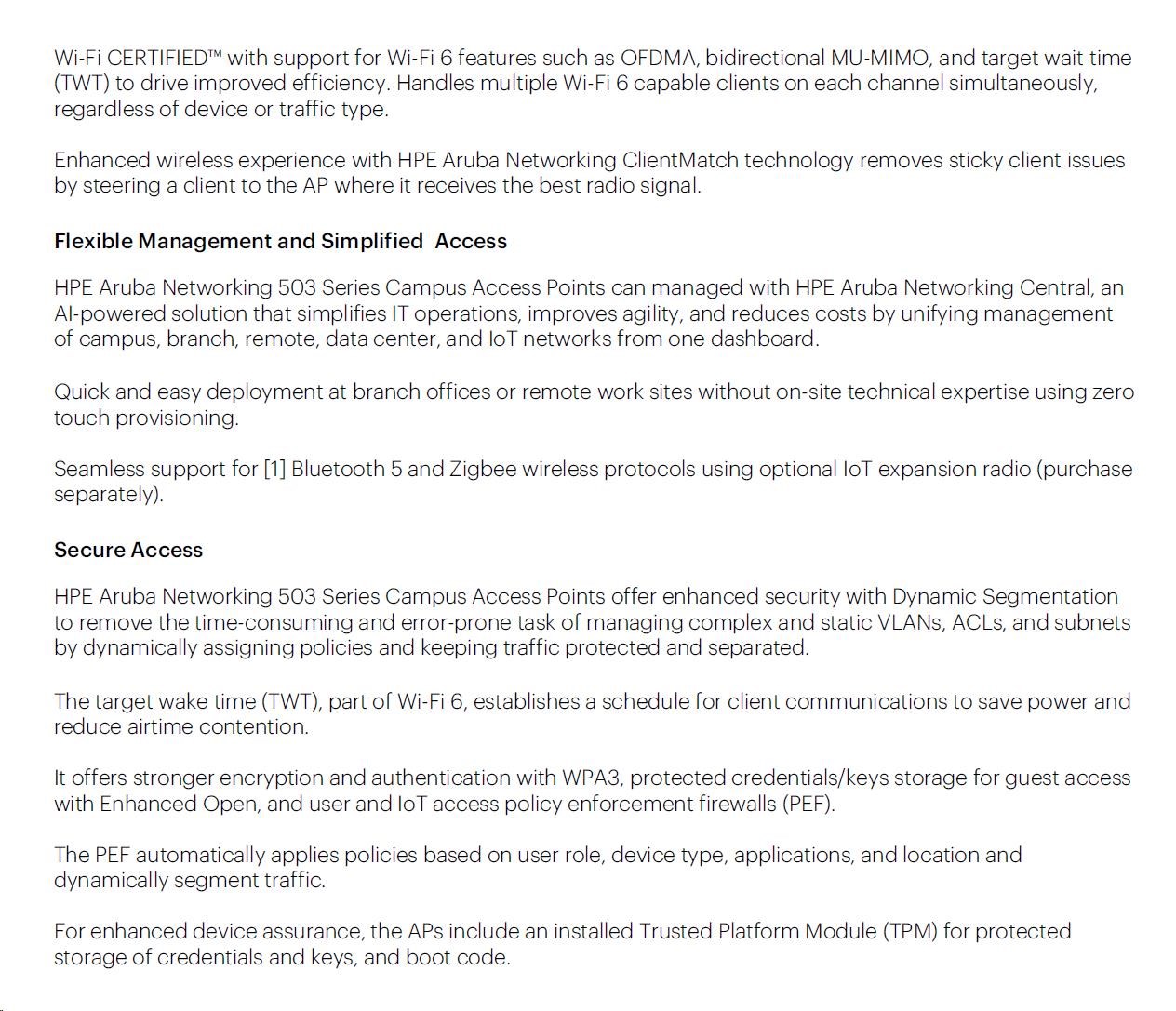 | Flexible Operation and Management Our unified APs can operate as standalone access points or with a gateway for greater scalability, security, and manageability. APs can be deployed using zero touch provisioning - without on-site technical expertise - for ease of implementation in branch offices and for remote work. Aruba APs can be managed using cloud-based or on-premises solutions for any campus, branch, or remote work environment. As the management and orchestration console for Aruba ESP (Edge Services Platform), Aruba Central provides a single pane of glass for overseeing every aspect of wired and wireless LANs, WANs, and VPNs. AI-powered analytics, end-to-end orchestration and automation, and advanced security features are built natively into the solution. The 503 Series APs can also be deployed using HPE Greenlake for Aruba for flexible consumption and financing options.