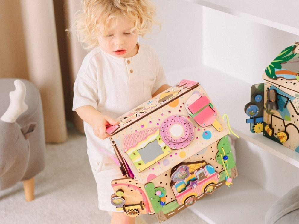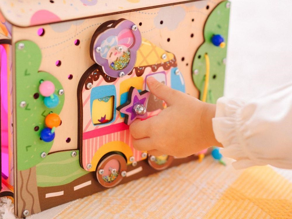 Originální svítící domeček activity board zavede děti do fantastického světa sladkostí. Se zmrzlinářským autem, s mlsným medvídkem a se spoustou montessori a hracích prvků se děti vydají za sladkým dobrodružstvím, při kterém se skvěle zabaví a zdokonalí své dovednosti. Každá strana activity boardu je originální a nabízí nespočet možností ke hře. Acitivity board domeček Cukrovinky je navíc svítící, po zapnutí světla se uvnitř domečku rozsvítí růžové světlo..