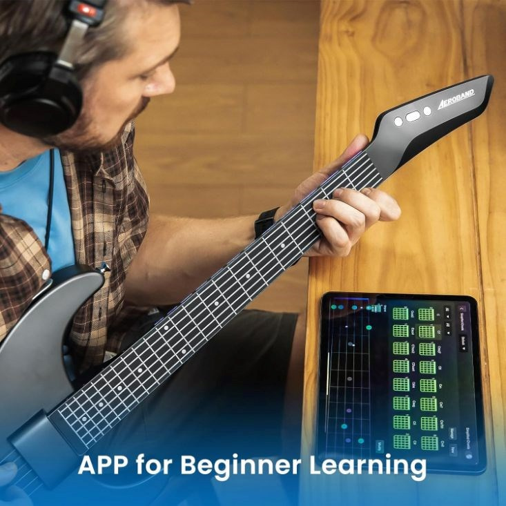 AeroBand Guitar lze propojit s aplikací, která nabízí bohatší funkce. Využijte například režim cvičení nebo herní režim pro zjednodušení složitých akordů.
