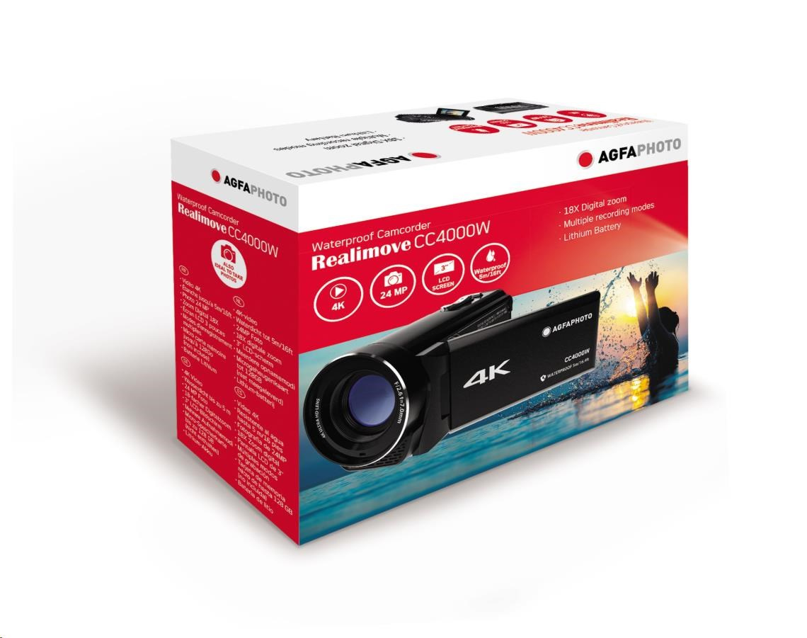 Vodotěsná videokamera Agfa Photo Realimove CC4000W je ideální pro amatéry i otrlé tvůrce video obsahu. Její kvalitu videa a fotografií, kloubový displej, 18× digitální zoom a možnost natáčet 4K videa si zamilujete!