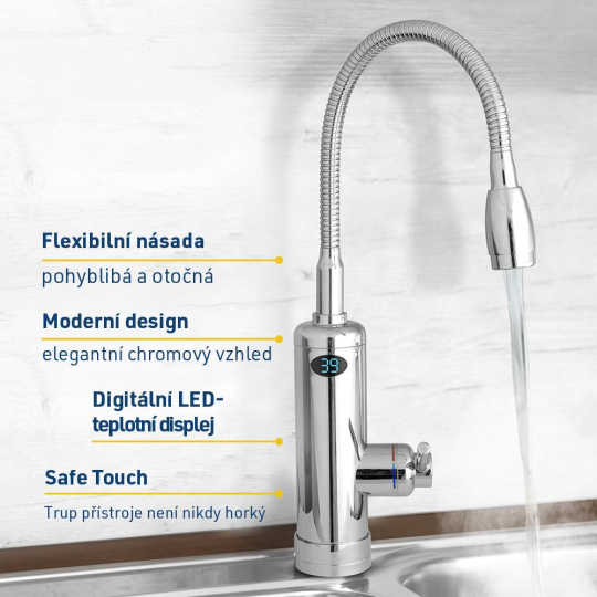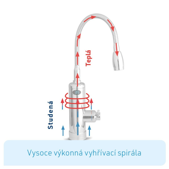 Protékající voda je okamžitě ohřívána vestavěnou vysoce výkonnou topnou spirálou, a proto vychází z baterie Aquadon příjemně teplá během několika vteřin.