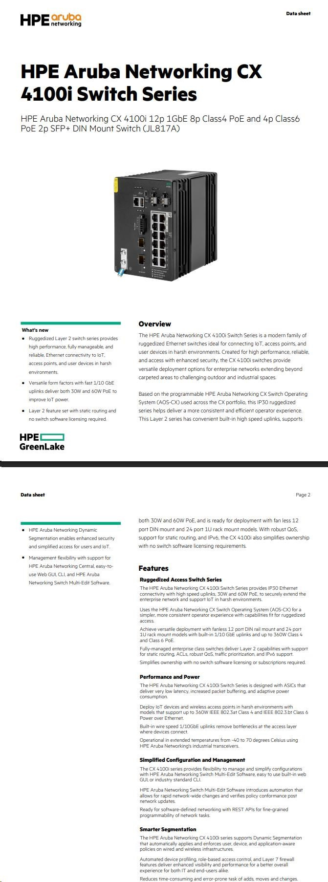 Aruba 4100i 12-port 1GbE (8-port Class 4 POE and 4-port Class 6 POE) 2-port SFP+ DIN Mount Switch (JL817A)