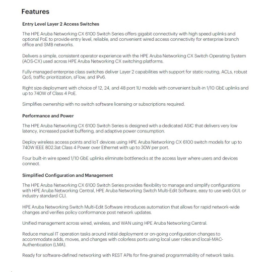 Differentiator 48x 10/100/1000BASE-T ports, 4x 1G/10G SFP ports, Class 4 PoE, Fixed fans and power supply