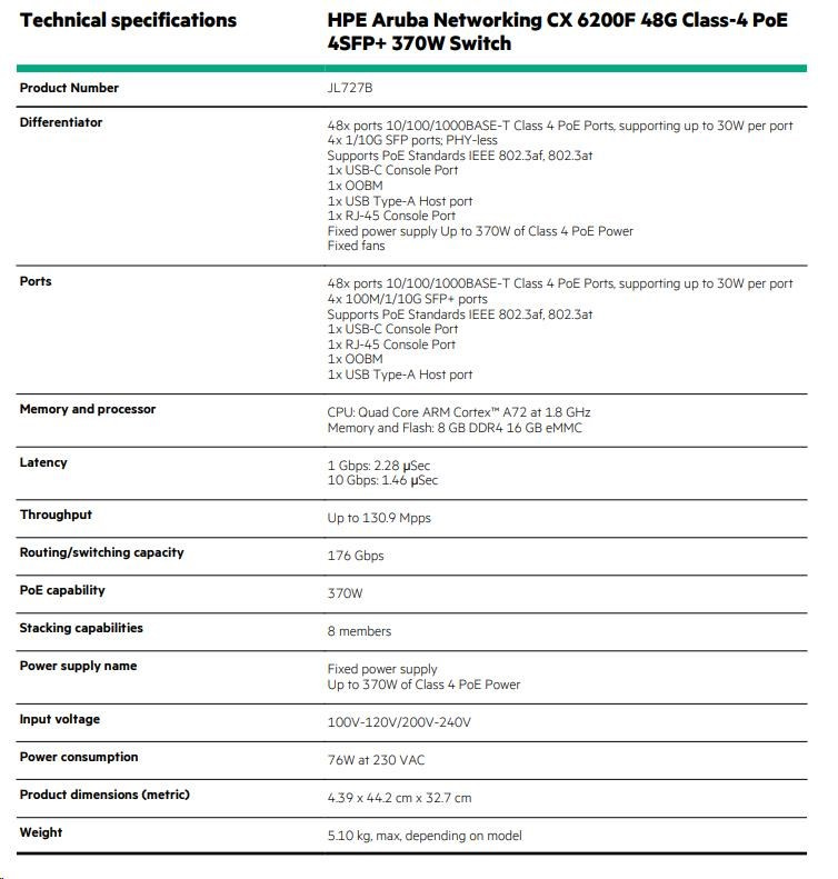 HPE Aruba Networking CX 6200F 48G Class4 PoE 4SFP+ 370W Switch JL727A RENEW