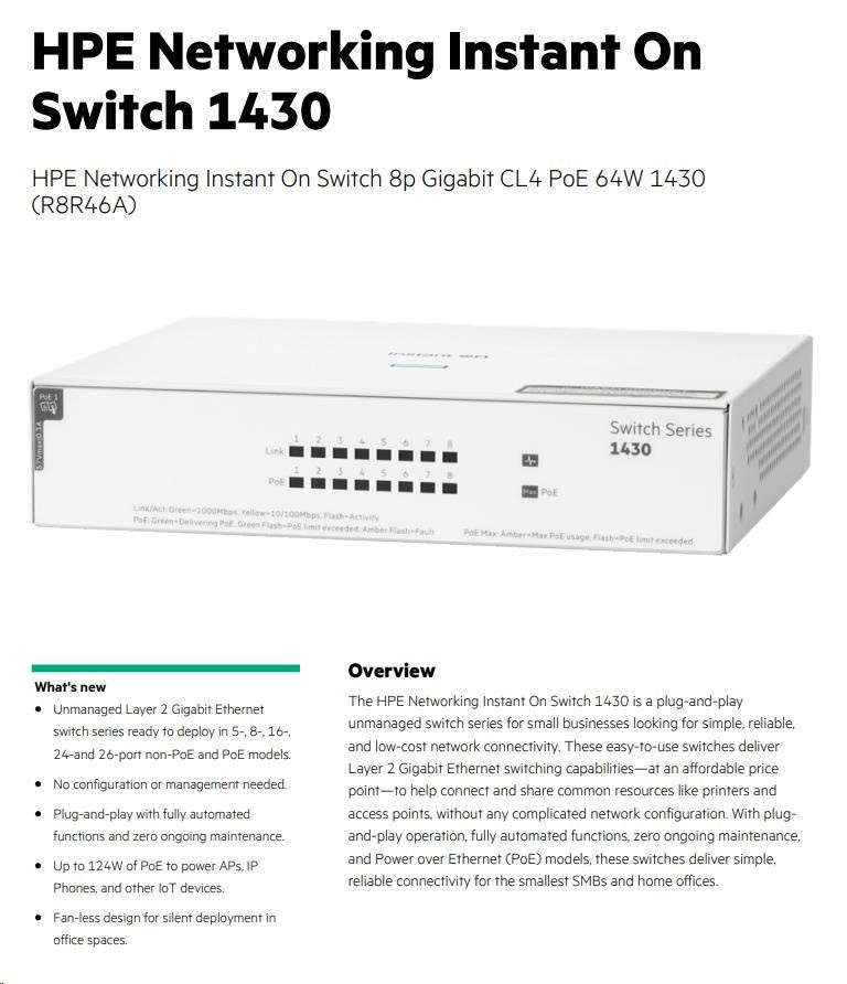 HPE Networking Instant On Switch 8p Gigabit CL4 PoE 64W 1430