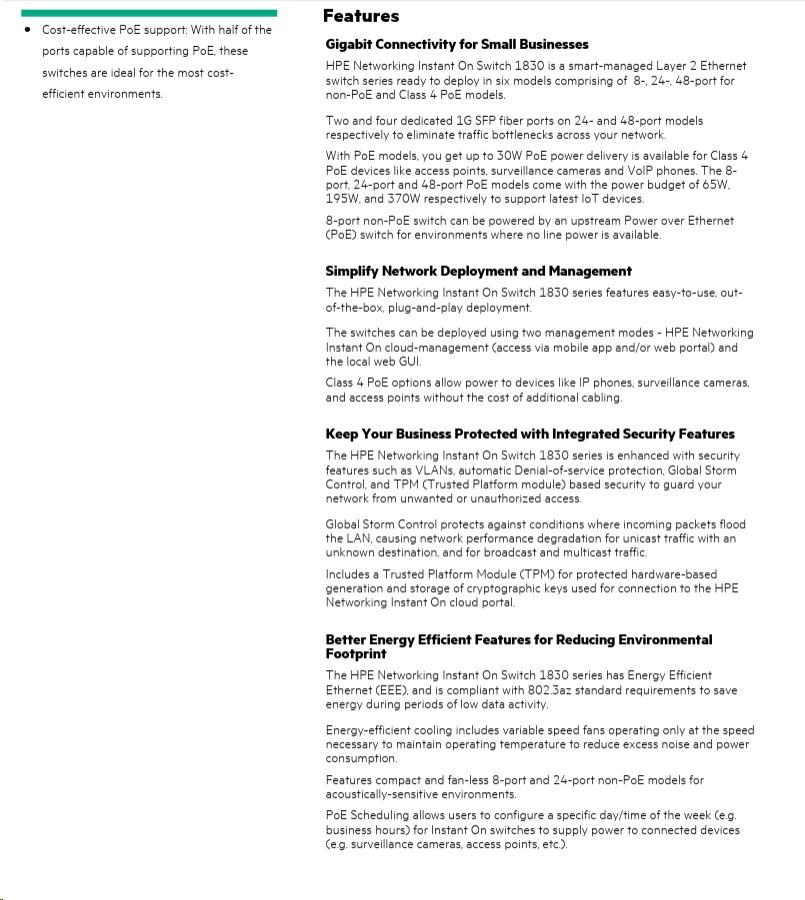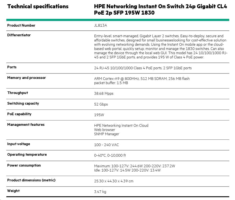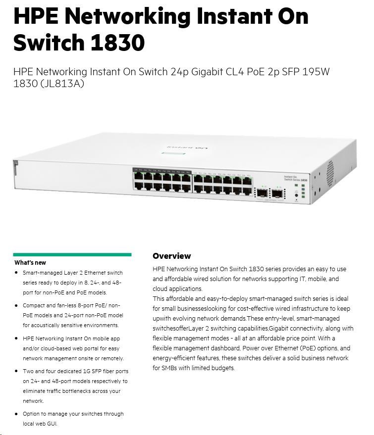 HPE Networking Instant On Switch 24p Gigabit CL4 PoE 2p SFP 195W 1830 (JL813A)