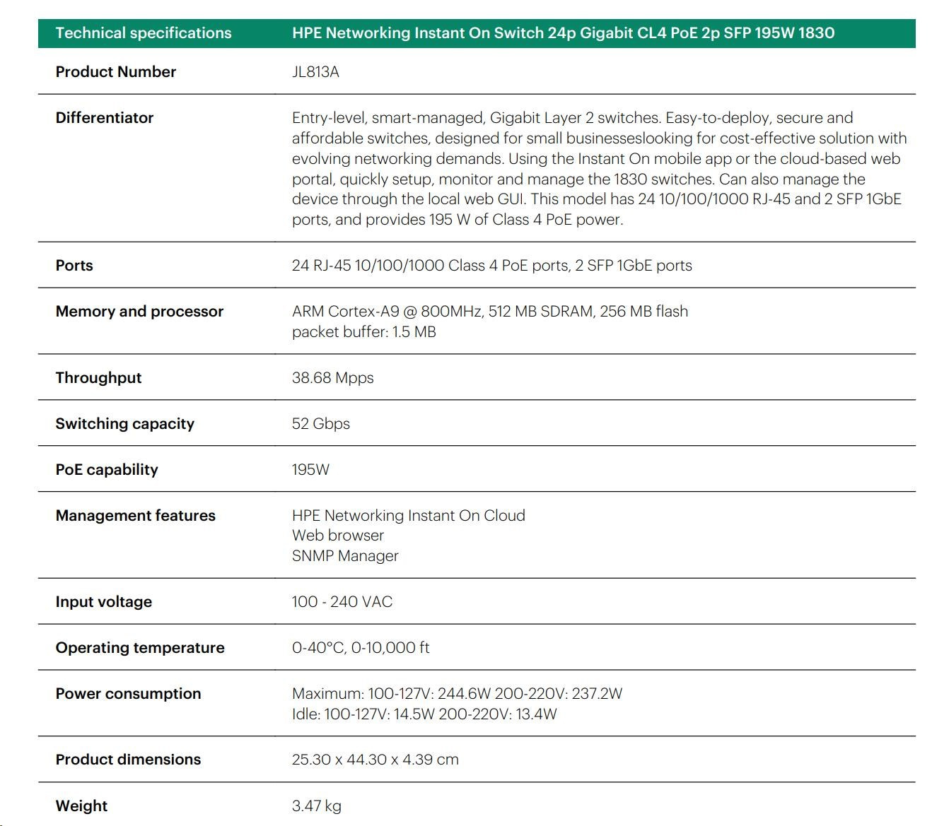 Aruba Instant On 1830 24G 12p Class4 PoE 2SFP 195W Switch (JL813A)