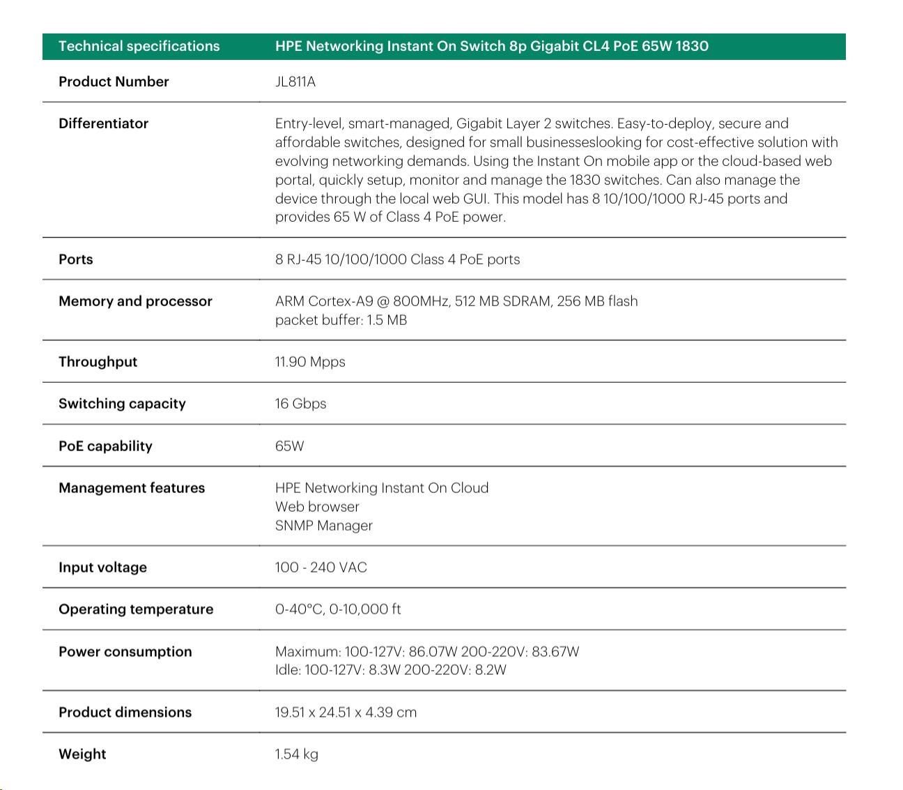 HPE Networking Instant On Switch 8p Gigabit CL4 PoE 65W 1830 (JL811A)