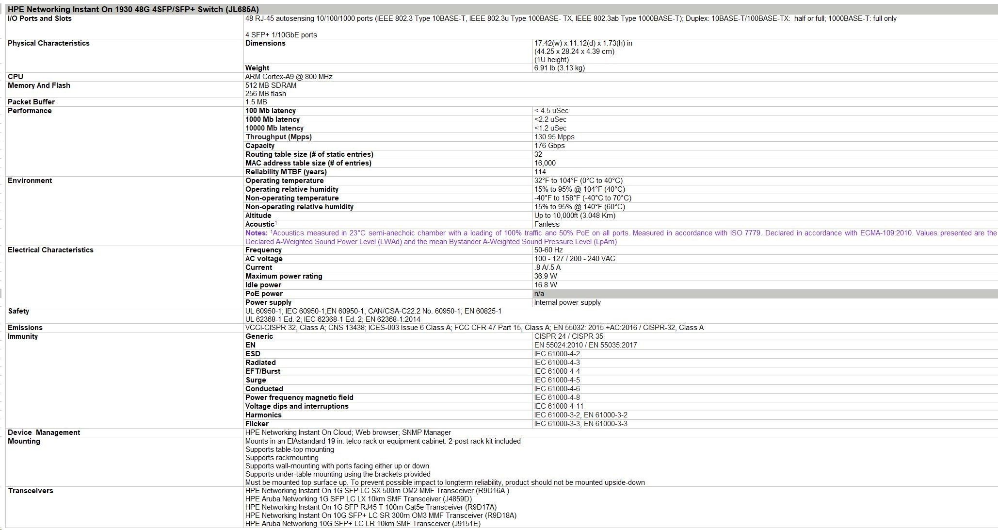 Notes: 1Acoustics measured in 23°C semi-anechoic chamber with a loading of 100% traffic and 50% PoE on all ports. Measured in accordance with ISO 7779. Declared in accordance with ECMA-109:2010. Values presented are the Declared A-Weighted Sound Power Level (LWAd) and the mean Bystander A-Weighted Sound Pressure Level (LpAm)