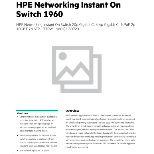 HPE Networking Instant On Switch 20p Gigabit CL4 4p Gigabit CL6 PoE 2p 10GBT 2p SFP+ 370W 1960 (JL807A).