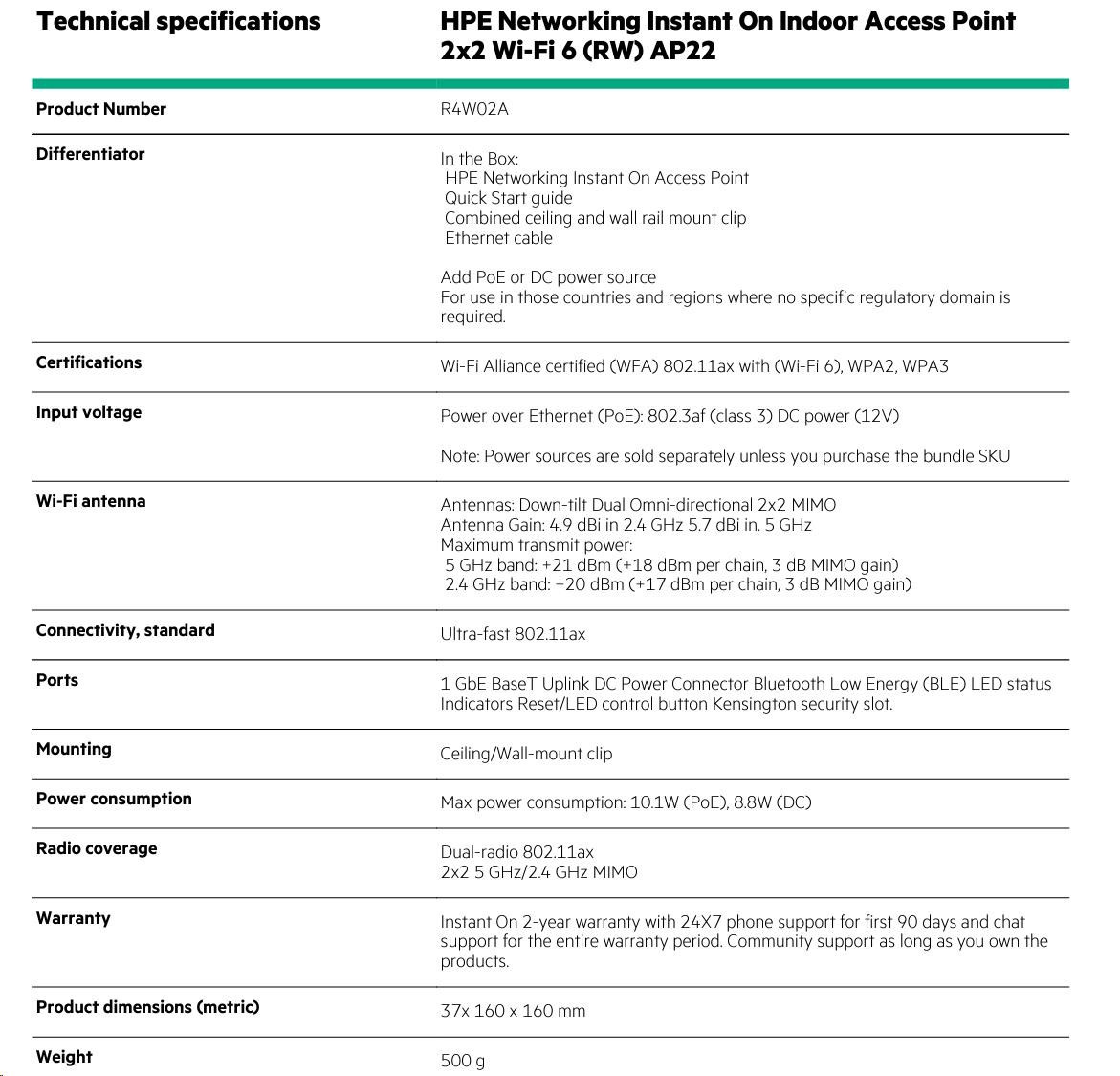 HPE Networking Instant On Indoor Access Point 2x2 Wi-Fi 6 (RW) AP22