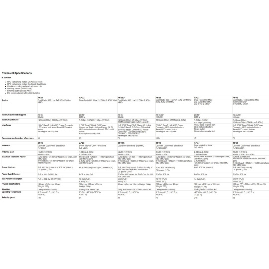 | Ultra-high-speed performance for high-density small businesses. Perfect for gaming, boutique hotels, tech start-ups and professional offices. The rise of the remote and hybrid workplace has placed increased pressure on business networks. Existing Wi-Fi infrastructure is struggling to support the explosion of devices and bandwidthhungry applications - all contributing to spotty video calls and sluggish download speeds. The Aruba Instant On AP25, a 4x4 Wi-Fi 6 access point, is designed to meet the increasing volume of connected devices. Delivering superior performance, coverage, and speed at a competitive price, the AP25 is the perfect access point for small and growing businesses. The Wi-Fi Certified 6TM AP25 delivers faster Wi-Fi speeds, greater capacity, and reduced latency between access points and devices for a superior Wi-Fi experience. AP25 improves efficiency and reduces congestion for networks with many connected devices, making it ideal for high-density environments. And with 4x the capacity of 802.11ac access points, the AP25 provides exceptional user experience, allowing businesses to serve more customers with higher speed and less congestion. Features of the AP25 include orthogonal frequency-division multiple access (OFDMA), multi-user MIMO and target wake time (TWT). With up to 4 spatial streams (4SS) and 160MHz channel bandwidth (HE160), the AP25 provides groundbreaking wireless capabilities for businesses looking to boost performance and future-proof their networks. |