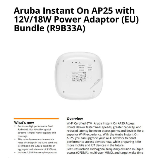 | Ultra-high-speed performance for high-density small businesses. Perfect for gaming, boutique hotels, tech start-ups and professional offices. The rise of the remote and hybrid workplace has placed increased pressure on business networks. Existing Wi-Fi infrastructure is struggling to support the explosion of devices and bandwidthhungry applications - all contributing to spotty video calls and sluggish download speeds. The Aruba Instant On AP25, a 4x4 Wi-Fi 6 access point, is designed to meet the increasing volume of connected devices. Delivering superior performance, coverage, and speed at a competitive price, the AP25 is the perfect access point for small and growing businesses. The Wi-Fi Certified 6TM AP25 delivers faster Wi-Fi speeds, greater capacity, and reduced latency between access points and devices for a superior Wi-Fi experience. AP25 improves efficiency and reduces congestion for networks with many connected devices, making it ideal for high-density environments. And with 4x the capacity of 802.11ac access points, the AP25 provides exceptional user experience, allowing businesses to serve more customers with higher speed and less congestion. Features of the AP25 include orthogonal frequency-division multiple access (OFDMA), multi-user MIMO and target wake time (TWT). With up to 4 spatial streams (4SS) and 160MHz channel bandwidth (HE160), the AP25 provides groundbreaking wireless capabilities for businesses looking to boost performance and future-proof their networks. |