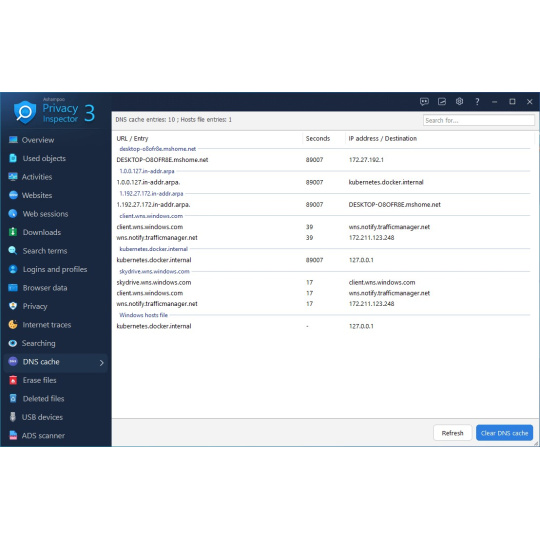 Věděli jste, že váš počítač ukládá IP adresy navštívených webových stránek do mezipaměti DNS, aby se zrychlilo načítání? Prohlížení se tak sice zrychluje, ale položky mohou zastarat nebo být během útoku zmanipulovány (DNS spoofing). S novým modulem DNS Cache máte vše pod kontrolou! Mezipaměť si můžete nejen podrobně prohlédnout, ale také ji snadno vymazat, když nastanou problémy. Můžete dokonce zkontrolovat podobně strukturovaný soubor hosts. To zajišťuje aktuální připojení a chrání vás před potenciálními bezpečnostními riziky!