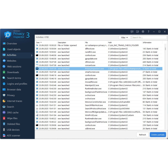 Možná používáte blokovače reklam, VPN a další prostředky k anonymnímu prohlížení webu, ale i tak na svém počítači zanecháte zjevné stopy o vyhledávacích výrazech, zadaných výrazech z formulářů a navštívených webových stránkách! Pomocí nástroje Ashampoo Privacy Inspector zkontrolujte nejen své stopy, ale i stopy kohokoli jiného, ??kdo váš počítač používá. Použijte filtry, abyste se zaměřili na to, co je pro vás relevantní, snadno projděte data z Chrome, Edge a Firefoxu a smažte vše, co nechcete zaznamenávat!