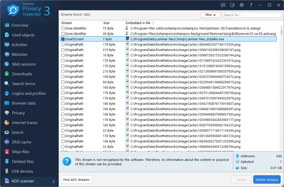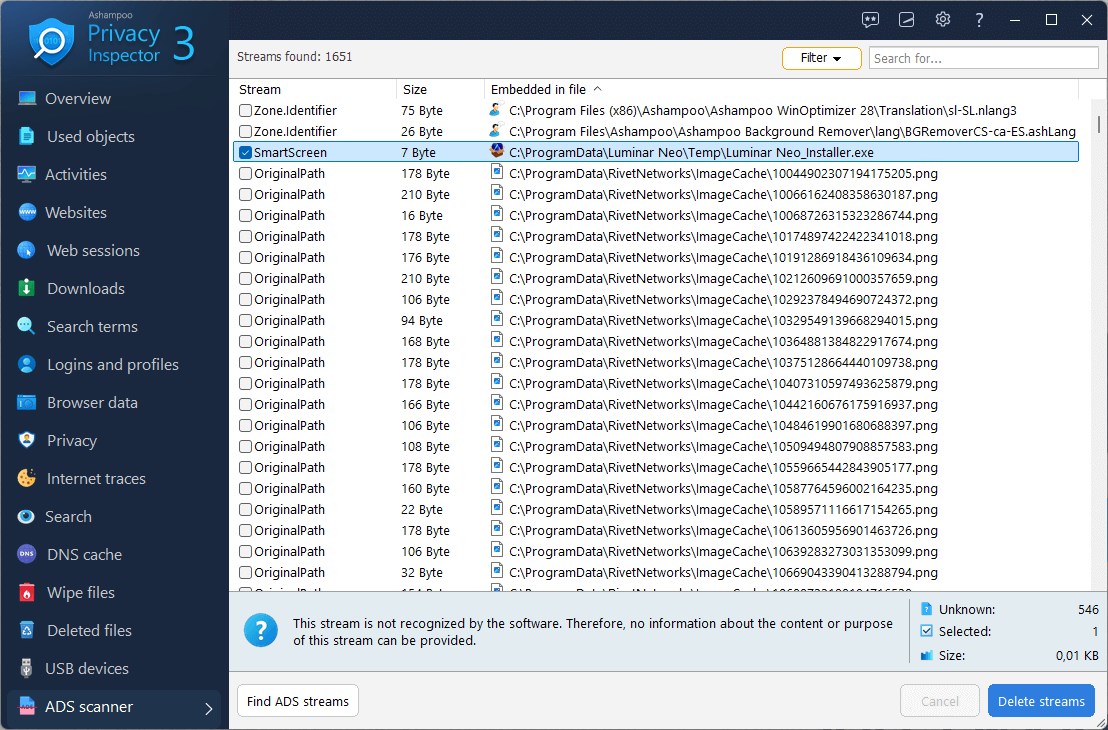 Slyšeli jste už o alternativních datových tocích (ADS)? Nástroj ADS Scanner identifikuje tyto skryté datové toky, které lze připojit k souborům, například informace přidané během stahování nebo vytvořené systémem. Tento nástroj vypíše všechny detekované ADS, poskytne podrobnosti o jejich původu a umožní vám bezpečně odstranit jakékoli podezřelé položky, což vám pomůže odhalit a eliminovat skryté stopy.