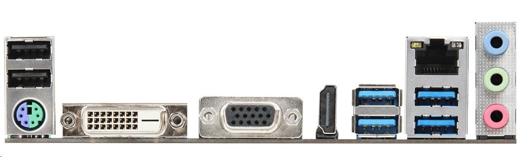 | Rear panel I/O | - 1 x PS/2 Mouse/Keyboard Port - 1 x D-Sub Port - 1 x DVI-D Port - 1 x HDMI Port - 2 x USB 2.0 Ports (Supports ESD Protection) - 4 x USB 3.1 Gen1 Ports (Supports ESD Protection) - 1 x RJ-45 LAN Port with LED (ACT/LINK LED and SPEED LED) - HD Audio Jacks: Line in / Front Speaker / Microphone |