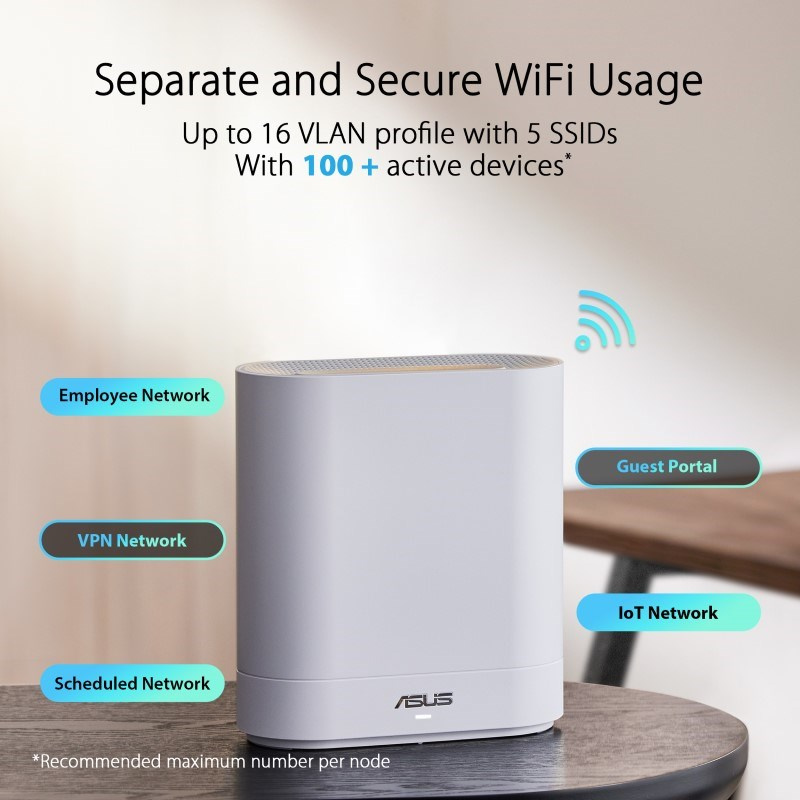 - Rozšiřitelné pokrytí WiFi – ExpertWiFi poskytuje až 12 síťových připojení uzlů pro rozšíření vaší obchodní sítě o funkce AiMesh.