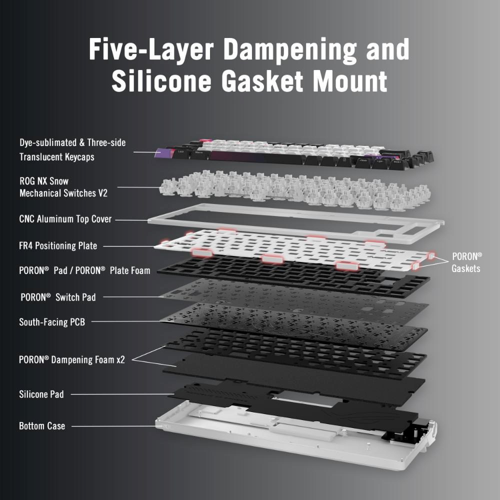 - Uchycení těsnění a pětivrstvé tlumení: Jedna silikonová a čtyři vrstvy PORON® pohlcují vibrace a pingání spínačů pro dokonalou akustiku