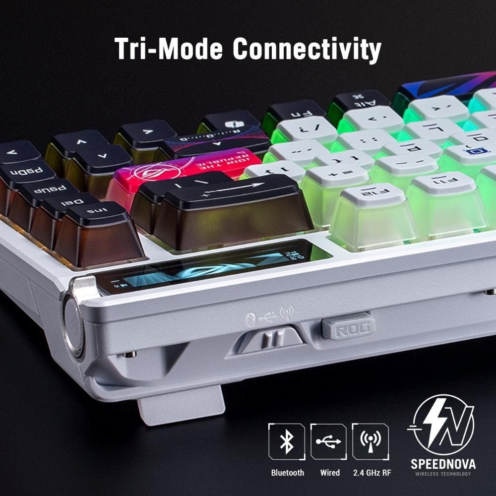 Vlastní herní klávesnice ROG Azoth X 75% s mechanickými spínači ROG NX V2 vyměnitelnými za provozu, barvenými a poloprůhlednými klávesami, kovovým horním krytem, těsněním, pětivrstvou tlumicí pěnou, polohovací deskou FR4, deskou plošných spojů orientovanou na jih, třírežimovým připojením s technologií SpeedNova 2,4 GHz, displejem OLED, třísměrným ovládacím kolečkem, opěrkou zápěstí, třemi úhly náklonu a podporou počítačů Mac.