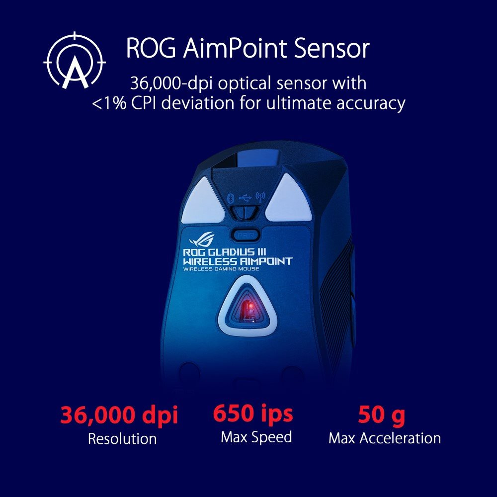 ROG Gladius III Wireless AimPoint je lehká 79gramová bezdrátová herní myš RGB, která je vybavena optickým senzorem ROG AimPoint s rozlišením 36 000 dpi, konektivitou ve třech režimech, bezdrátovou technologií ROG SpeedNova, vyměnitelnými spínači myši, mikrospínači ROG, mechanismem otočných tlačítek pro 0 Latence kliknutí ms, ergonomický design, ROG Paracord, nožičky myši ze 100% PTFE, šest programovatelných tlačítek a páska na uchopení myši.