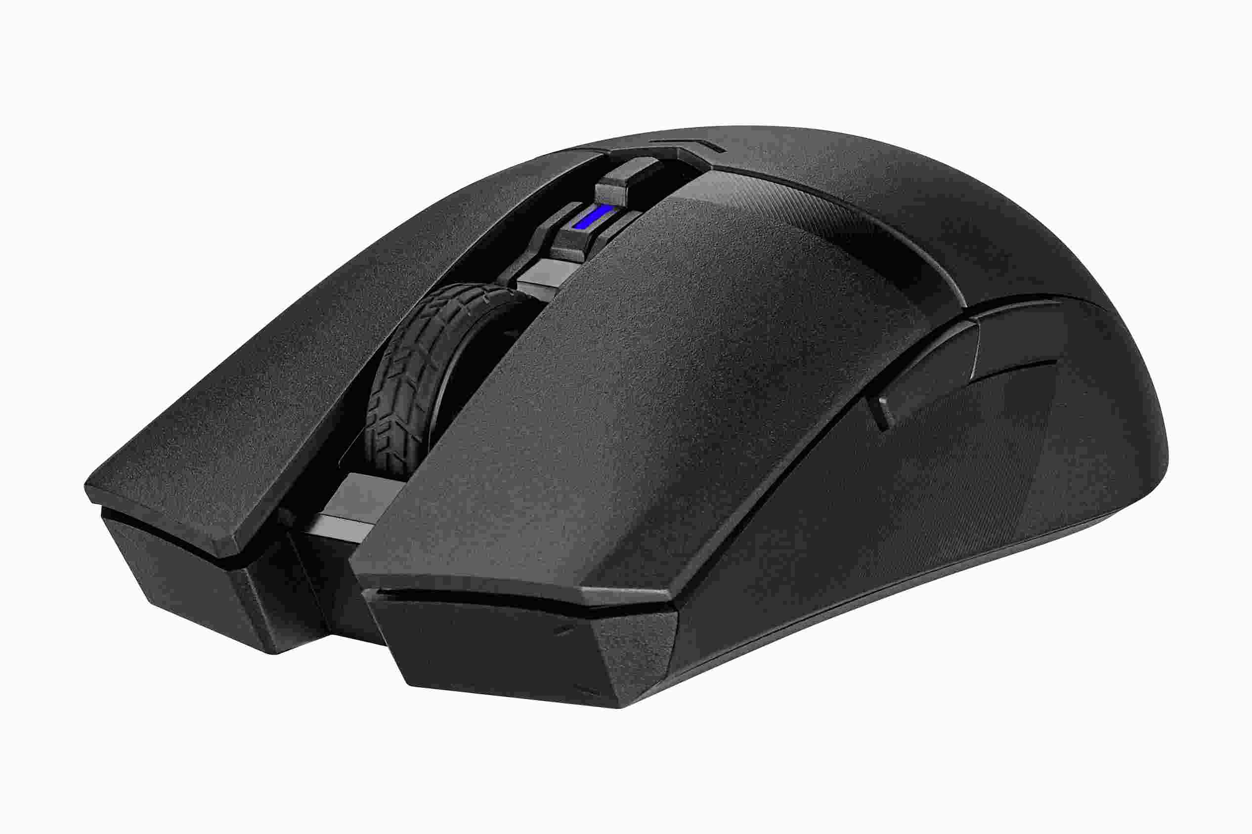 A lightweight ambidextrous gaming mouse with dual wireless modes, a 12,000 dpi sensor, six programmable buttons, PBT top cover with ASUS Antibacterial Guard, 100% PTFE mouse feet and Armoury Crate.