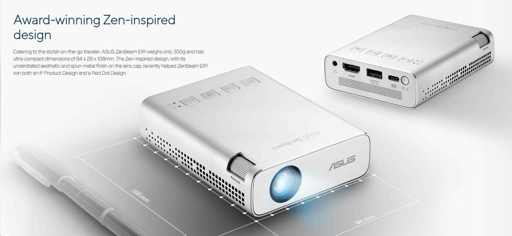 ASUS ZenBeam E1R mini LED projector – 200 LED lumens, WVGA (854x480) resolution, automatic portrait projection mode, built-in battery for up to 4-hour portable video playback , power bank, USB Type-A, HDMI
