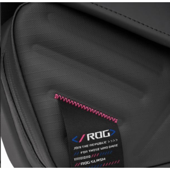 Brašny ROG SLASH jsou sice nenápadné, ale pro ty, kteří si jich všimnou, představují odvážné prohlášení. Modré a růžové akcenty a prošívání zdobí tašku, dodávají jí barevný nádech a zajišťují, aby svět věděl, že nosíte něco opravdu výjimečného. Vzhled ROG SLASH je také vybaven jedinečným monogramem ROG.