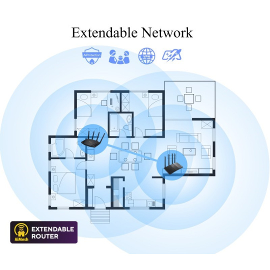 - Snadno rozšiřitelná síť - Vychutnejte si bezproblémový roaming s bohatými pokročilými funkcemi přidáním libovolného routeru kompatibilního s AiMesh.