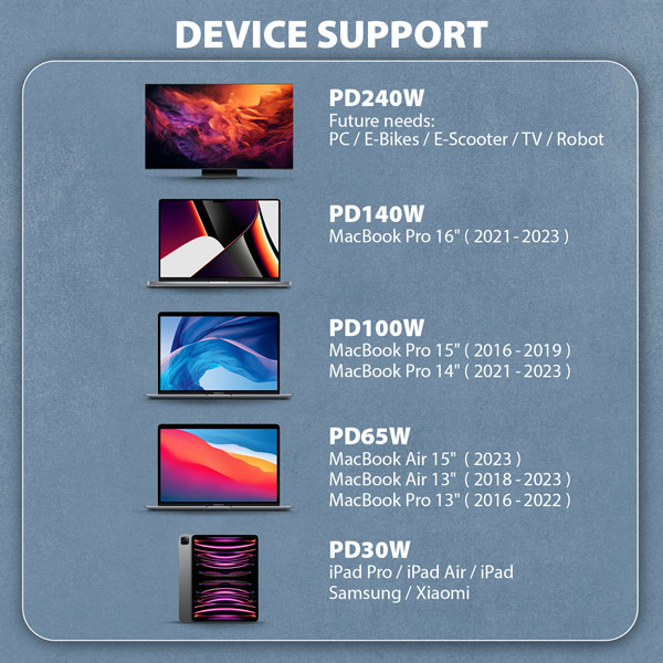 • Vhodný pro počítače, notebooky, mobilní telefony, tablety, powerbanky, elektrické nářadí a další zařízení s USB-C konektorem.