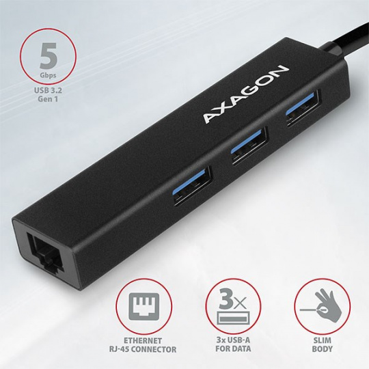 AXAGON HMA-GL3A, USB 3.2 Gen 1 hub, porty 3x USB-A + Gigabit Ethernet, kovový, kabel USB-A 20cm