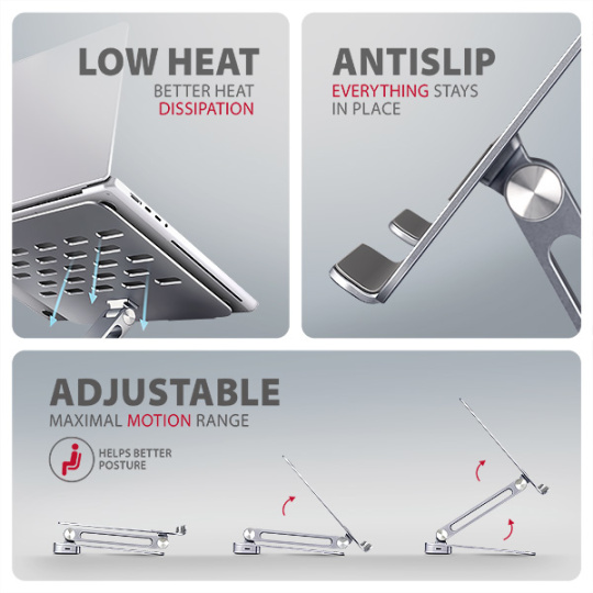 Velkou výhodou stojanu je chytré řešení s dvojitým kloubem, které umožňuje nastavit úhel náklonu i výšku obrazovky notebooku tak, aby byla v jedné rovině s externím monitorem. Tím získáte další pracovní plochu ve správné úrovni očí, což výrazně zlepšuje ergonomii, zvyšuje pohodlí při práci a podporuje vaši produktivitu.