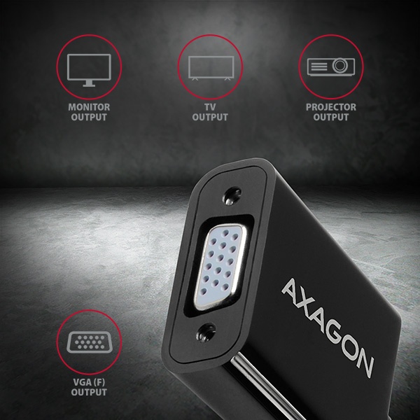 DisplayPort -> VGA aktivní adaptér AXAGON RVD-VGN pro připojení staršího VGA monitoru/TV/projektoru k počítači nebo jinému zařízení s výstupem Display Port.