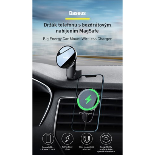 Baseus Big Energy držák s bezdrátovým nabíjením 15W černá (kompatibilní s Apple iPhone 12 Series)