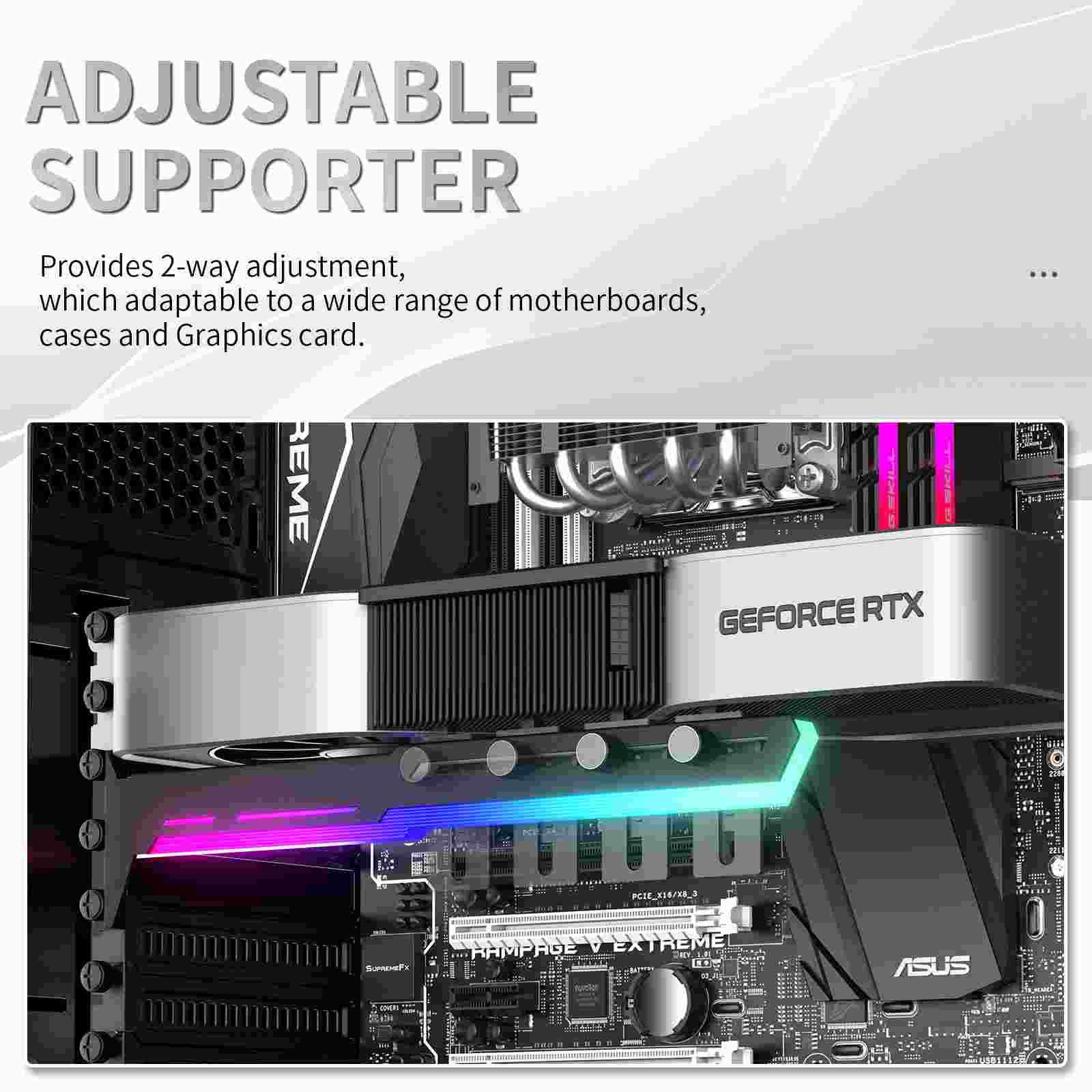 Stylová varianta této opory Vaší grafické karty je vyrobena z ocelového práškově lakovaného plechu a plastu, zabraňuje prohýbání větších karet ve slotu a dodává tak sestavě lepší celkovou stabilitu. Součástí je silikonová posuvná opora, kterou lze posunout jak horizontálně tak i vertikálně a umožňuje instalaci v různých místech karty, pro maximální kompatibilitu s většinou karet. Rozměry držáku jsou 280 x 52mm.
