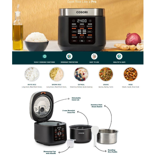 Multifunkční rýžovar Cosori nabízí různé možnosti přípravy pokrmů: různé druhy a úrovně přípravy rýže (podle chuti - standardní, měkká nebo tvrdší), kaše a jiné obiloviny, ale také další funkce jako režim pomalého vaření, vaření v páře, dušení, režim udržování teploty, odložené vaření, pečení nebo režim rychlé přípravy rýže.