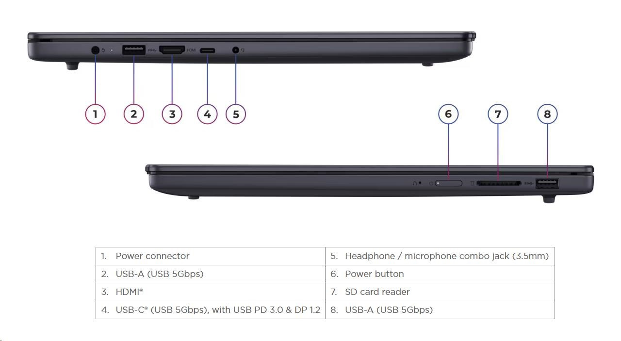| Standartné porty | 2x USB-A (USB 5Gbps / USB 3.2 Gen 1) 1x USB-C® (USB 5Gbps / USB 3.2 Gen 1), with USB PD 3.0 and DisplayPort™ 1.2 1x HDMI® 1.4 1x Headphone / microphone combo jack (3.5mm) 1x SD card reader 1x Power connector |