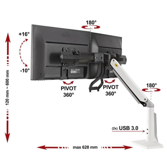 Stolní držák na 2 monitory 19-27", otočný +/-180°, sklopný +16°/-10°, nastavení výšky 120-600mm, vzdálenost od úchytu dle natočení 0-628mm, 2x port USB 3.0, 2 typy stolních úchytů, systém vedení kabeláže, VESA 75x75 a 100x100, nosnost 12kg, bílé provedení.... více