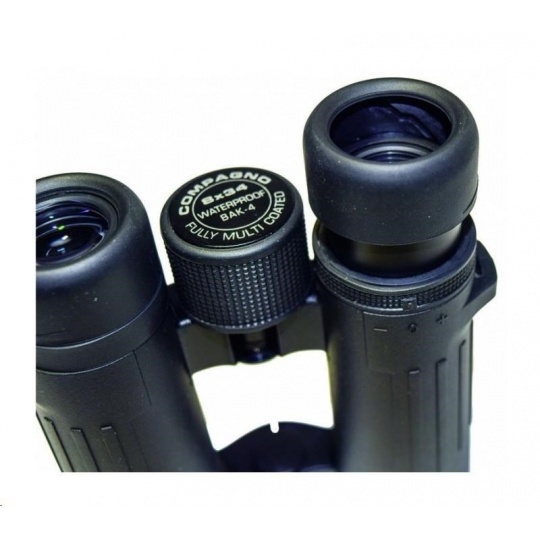 Dalekohled kompaktní COMPAGNO 8x34, zvětšení 8x, přední čočka 34mm, zorné pole 124m, ostré od 4m, optický výstup 4,2mm, vzdálenost středu očí 56-74mm s odstupem 17,4mm, světelnost 17,6, stmívání 10,9, rozměry 130x126x45 mm, hmotnost 450g, černý. Dalekohledy kompaktní DCF se střechovými hranoly BaK4 - ROOF (DACH). Modelová řada s moderním designem, malými rozměry, nízkou hmotností a vysokou optickou kvalitou pro kontrastní pohled i při zhoršených světelných podmínkách. Výkonný a odolný dalekohled s Fully Multicoated úpravou, hranoly z BaK4 skla, voděodolný do 0,5m/15min s ochranou proti zamlžení plněním Dusíkem, vhodné i pro sledování s brýlemi, nastavení +/-4 dioptrie, výsuvné krytky okuláru, stativový závit, pogumováné tělo z ABS. Včetně textilního pouzdra, popruhu a čistícího hadříku. Malý ale maximálně výkonný dalekohled do kapsy pro turistiku..