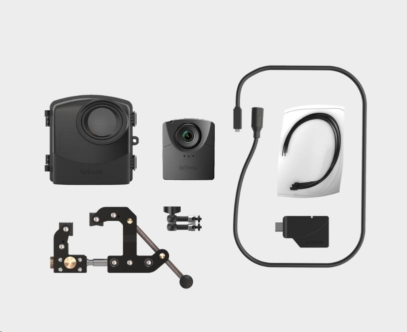 Sada stavební kamery Brinno BCC2000 Plus obsahuje časosběrnou kameru TLC2000, nástavec pro notebook nebo tablet, svorkový držák a vodotěsné pouzdro a baterii.