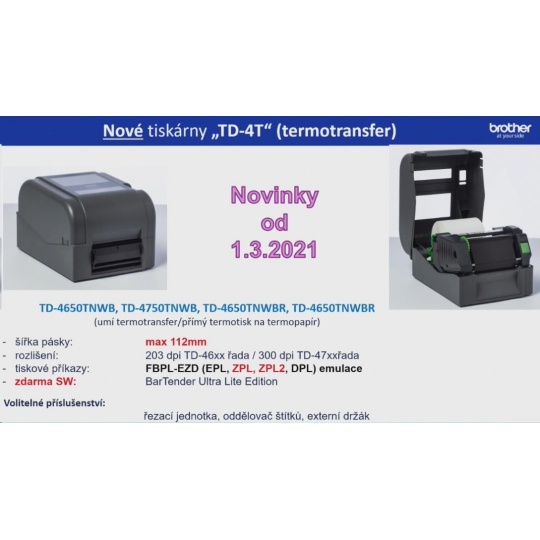 BROTHER tiskárna štítků TD-4750TNWB (tisk štítků, 300 dpi, max šířka štítků 112 mm) USB,LAN,WiFi,Bluetooth,RS-232C