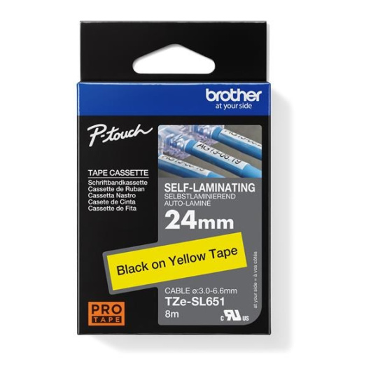 Samolaminovací páska TZe-SL651 s délkou 24 mm s černým tiskem na žluté byla vyvinutá pro dlouhodobou identifikaci síťových kabelů. Má speciální lepicí vlastnosti štítků pro trvanlivé pevné ovinutí kolem vašich vodičů a kabelů. Kompatibilní s některými modely P-touch, které používají pásky TZe 24 mm a 36 mm.