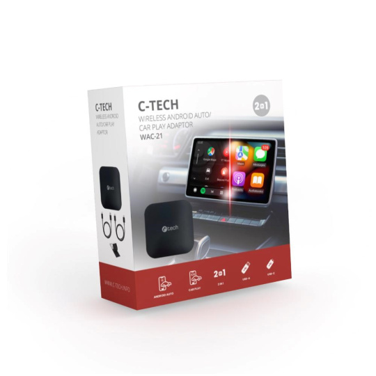 Užijte si naprostou svobodu a pohodlí s kombinovaným adaptérem C-TECH WAC-21, který umožňuje snadné propojení vašeho automobilu s bezdrátovými verzemi Android Auto i Car Play. Tento jedinečný adaptér kombinuje funkce pro obě platformy, což znamená, že nezáleží na tom, jaký telefon máte – vždy si vychutnáte přístup k oblíbeným funkcím, aplikacím a službám přímo na obrazovce palubního počítače vašeho vozu.