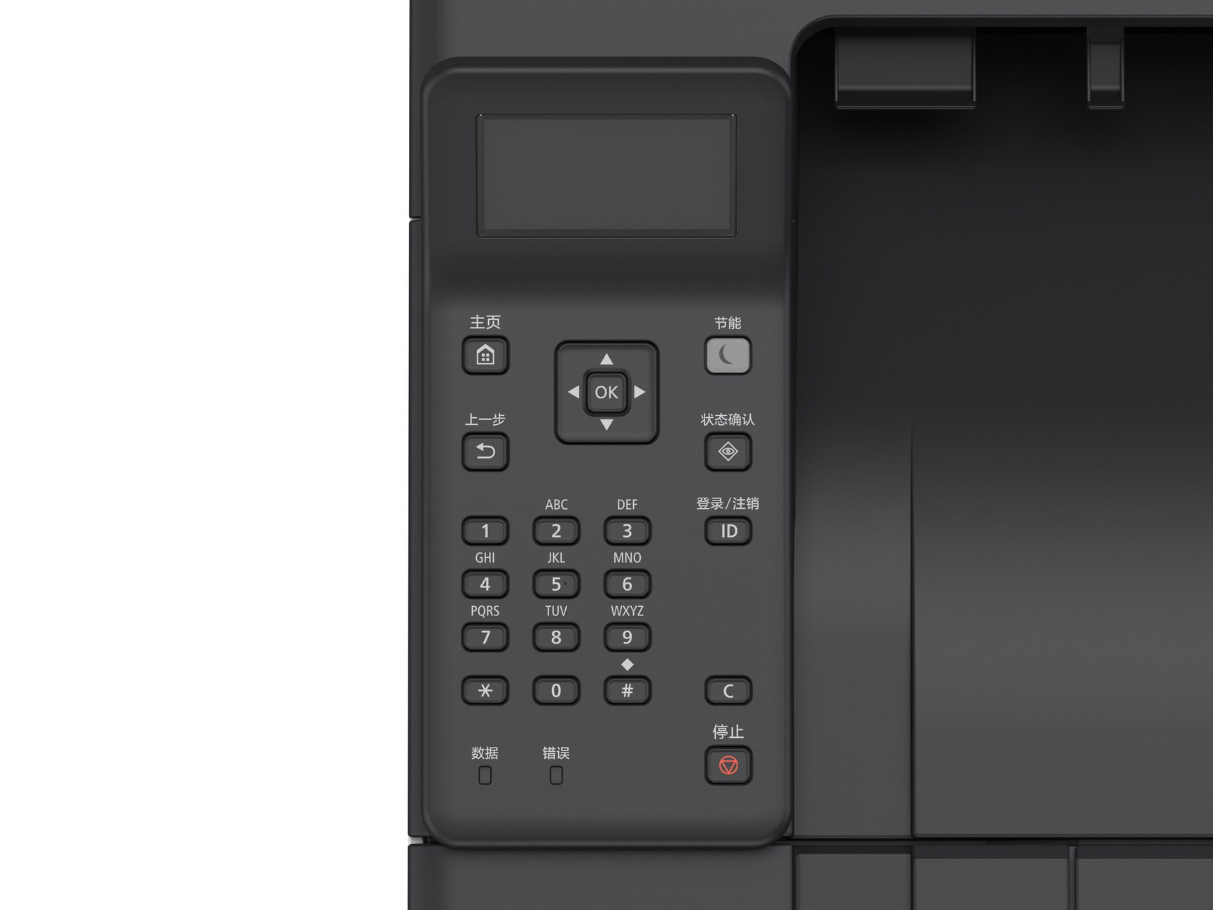 | Ovládací panel | Displej LCD s 5 řádky, 3 indikátory LED (pro úlohy, chyby a úsporný režim), tlačítka, číselná klávesnice s 10 tlačítky |