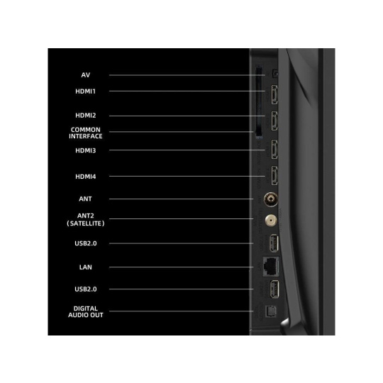 | Vstupy a výstupy: | AV vstup mini, CI+, digitální audio výstup, HDMI 2.1, USB 2.0, LAN, antény RF a LNB |