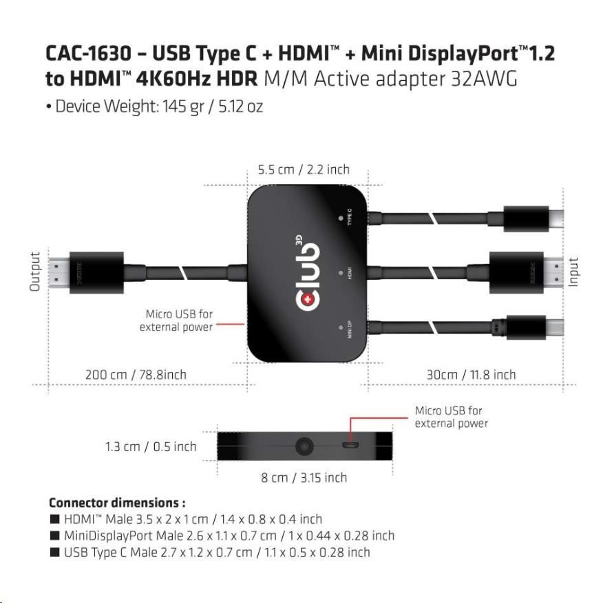 Product Name CAC-1630 USB Type C* + HDMI™ + Mini DisplayPort™1.2 to HDMI™ 4K60Hz HDR M/M Active adapter 32AWG