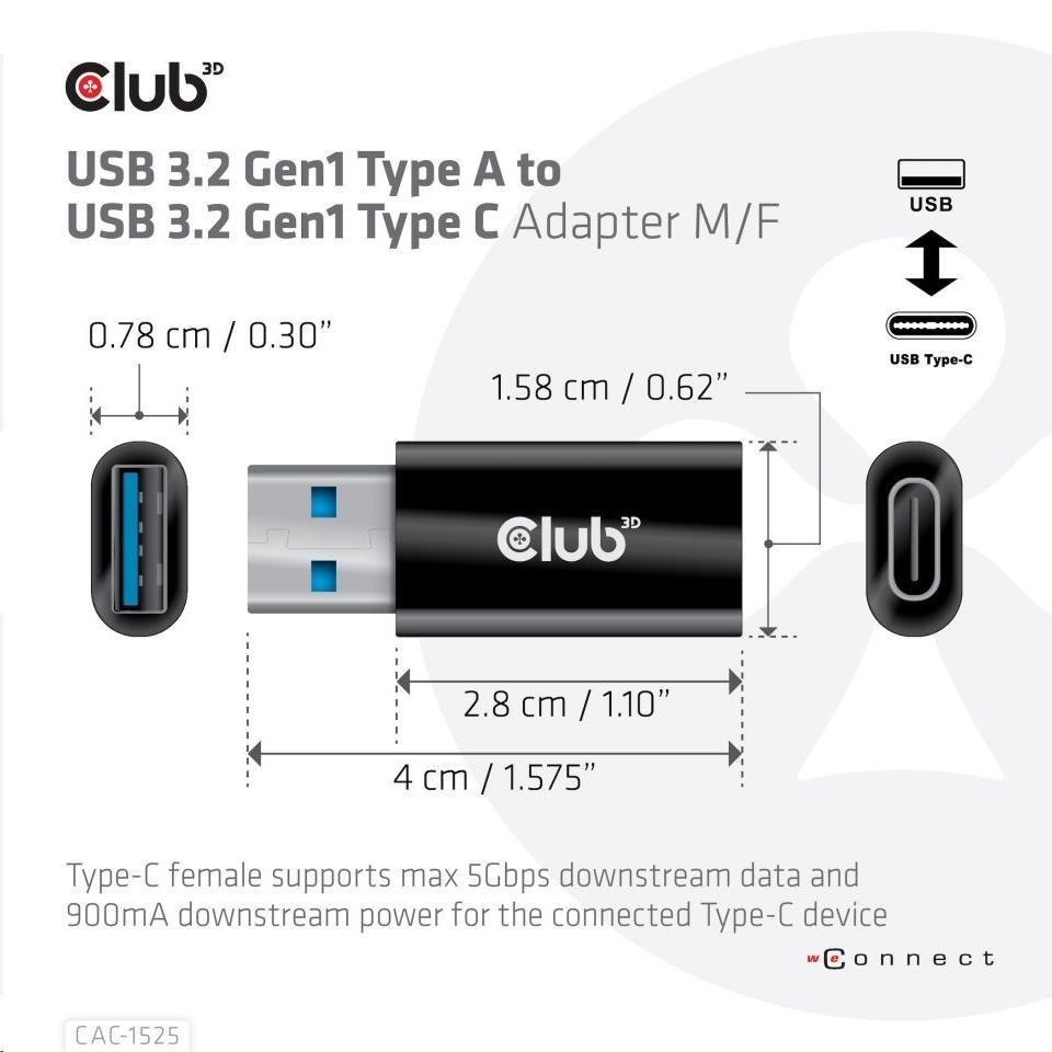CAC-1525 The Club 3D USB 3.2 Gen1 Type A to USB 3.2 Gen1 Type C Adapter which allows you to connect your host PC with USB-A port to devices (such as USB disk, mobile phone) with Type-C port for downstream data and power. Besides, you can also connect a Type-C to USB hub to your USB-A host PC through this product for downstream data and power transmission.